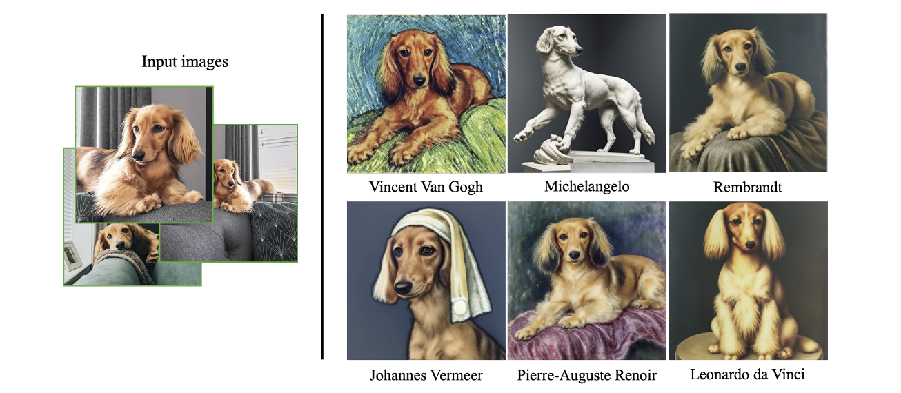 论文中举了一组狗的例子:仅使用 3 张图片作为训练的输入,成型的模型就可以在不同的提示词作用下生成不同场景或不同风格的画面中这种狗狗的画面,且狗狗和对应的提示词所表达的风格与场景融合的相当自然。所以,Dreambooth 模型就像一个“小照相亭”一样,一旦拍照成功,就可以 AI 生成的方式自动 P 到任何一个场景中去,且和场景融入得相当好。